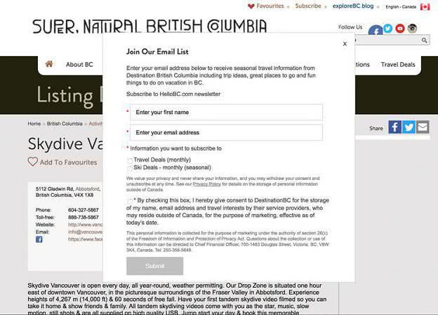 Релевантность: Плохо. Сайт Hellobc.com, название говорит «Необыкновенная Британская Колумбия», а содержание на странице — о прыжках с парашютом.