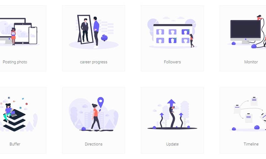 Если вам нужны стильные векторные иллюстрации с сильным акцентом на людей и технологии, unDraw обладает сотнями изображений, которые придутся вам по вкусу. Тут вы найдете много материалов, ориентированных на технологические веб-сайты, так что каждый здесь найдет что-то для себя. И самая полезная функция: используйте выпадающую палитру цветов в верхней части экрана, чтобы настроить основные цвета в соответствии с вашим брендом!