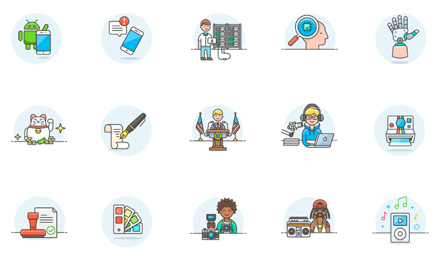 Вам нравится, как звучит — 50 красочных, мультяшных иконок, доступных для коммерческого использования? Здесь представлены люди, объекты и технологии. Каждая иконка поставляется с цветными, двухцветными и линейными версиями — и в шести разных форматах! Если вам придутся по душе представленные иконки, вы также можете приобрести премиум-пакеты или весь набор.