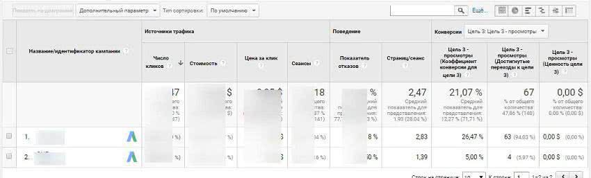 Отчет «Кампании» дает возможность задать нужную цель и оценить по ней картину – коэффициент конверсии, стоимость клика, процент отказов, стоимость цели и т.п. Можете смотреть и по всем целям сразу.