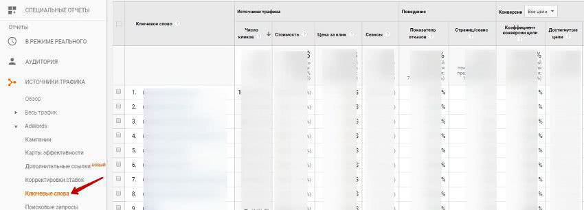 Отчет «Ключевые слова» покажет, какие ключи самые эффективные. Видно цену за клик, стоимость, показатель отказов, коэффициент конверсии.