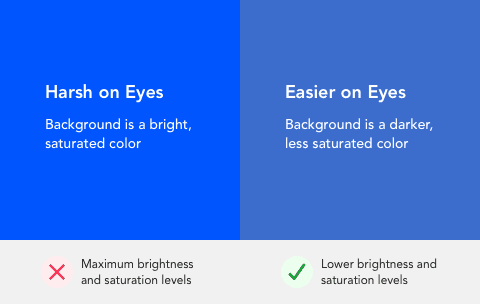 Лучше сделать цвет фона темнее и менее насыщенным. Затемнение уменьшает содержание белого в цвете, в то время как обесцвечивание цвета увеличивает содержание серого. Это вызывает интенсивность цвета, приемлемую для глаз.