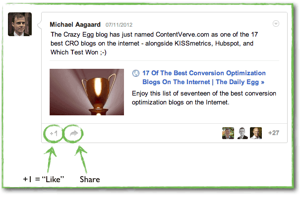 Репосты и + 1 — это не одно и то же, хотя оба они влияют на ваш AuthorRank. Репосты в Google+ важнее, чем + 1. Сегодня функция +1 похожа на Like на Facebook – легко зажать на «Нравится», но только очень хорошим материалом делятся.