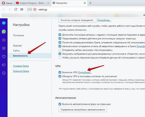 Браузер Opera «оборудован» по умолчанию встроенным VPN. Включается он в настройках: