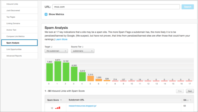 Инструмент анализа Moz Spam — это один из отличных способов проверки качества сайтов.