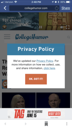 - Если это возможно, не показывайте всплывающие окна на первой странице. Дайте посетителям возможность акклиматизироваться в первую очередь. Для учета, однако, это один из типов всплывающих записей, которые Google допускает (поскольку конфиденциальность так важна).