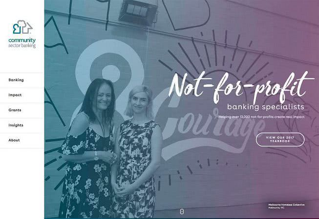 Пример ниже, Community Sector Banking, делает именно это. Выбор цвета интересен, а градиент — на фотографии и в нижней навигационной панели — усиливает цветовую палитру и ее отношение к бренду.
