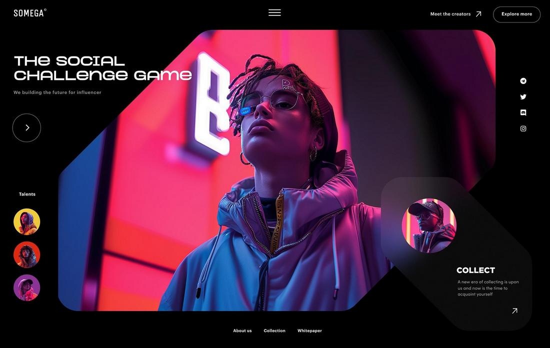 Насыщенные яркими и неоновыми градиентами цветовые решения в стиле киберпанк — идеальный выбор для представления технологически продвинутого будущего с антиутопической эстетикой. Как результат — это одна из самых популярных цветовых схем, используемых в веб-дизайне, особенно в проектах, связанных с искусственным интеллектом, криптовалютой, NFT, играми и спортом.