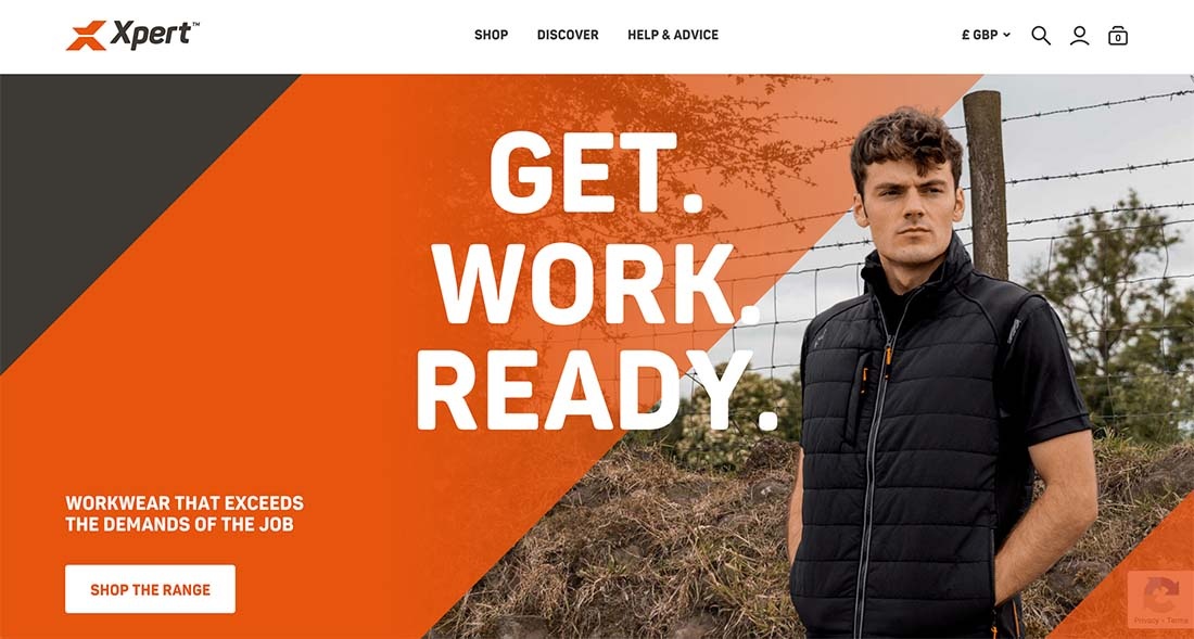 Xpert Workwear использовал приятные оранжевые оттенки, чтобы придать дизайну больше визуального интереса. Особенность оранжевого цвета для бренда спецодежды в том, что этот цвет часто ассоциируется с защитными жилетами для рабочих. Он также связывает дизайн с деталями самих предметов одежды, чтобы удерживать взгляд на экране.