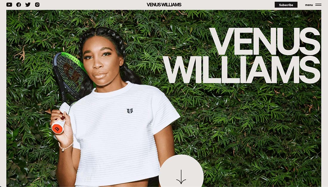 Винус Уильямс выбрала для своего сайта полноэкранное фото с большим количеством зелени в сочетании с бежевым фоном для всего дизайна. Все сделано просто и визуально приятно, а естественные цвета предоставляют достаточно много места для всех фотографий.