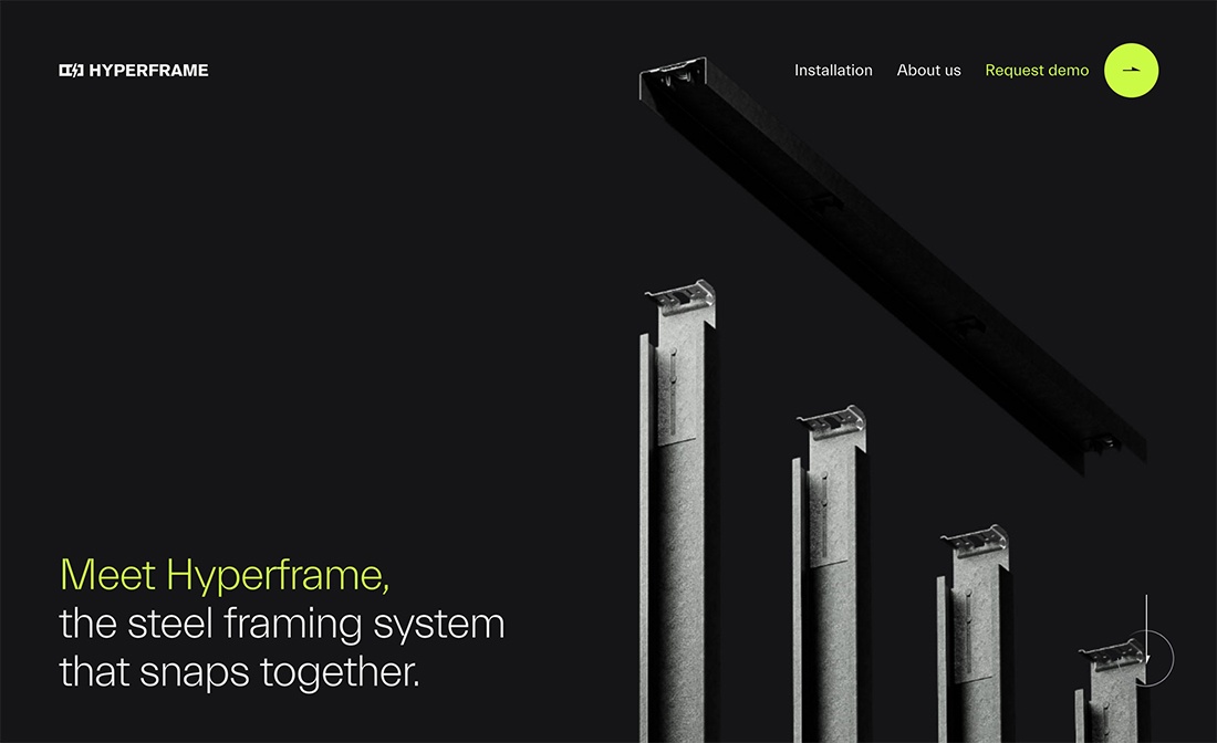 Лаймовый зеленый — популярный выбор, как показано выше на веб-сайте Hyperframe. Другие популярные цветовые решения включают оранжевый или ярко-синий.