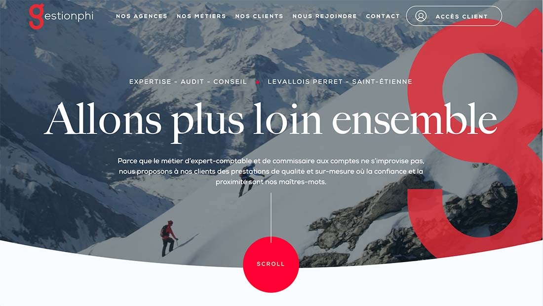 Gestionphi — классический пример красного акцента для понимания дизайна. Также приятно, что этот цвет является частью логотипа и используется в нескольких местах с различными оттенками. Красная кнопка прокрутки — элемент, который нельзя не заметить на экране благодаря выбору цвета.