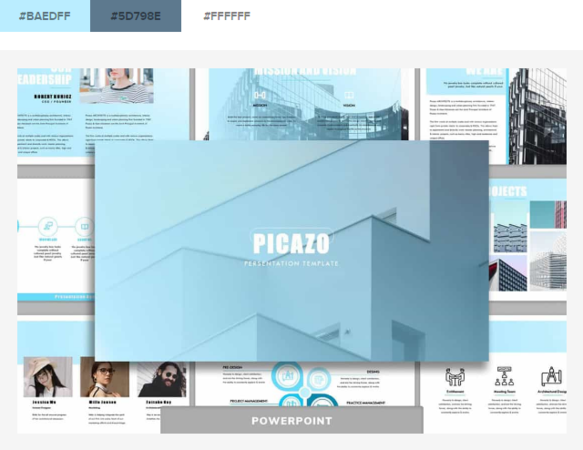 Светло синий — это классический цвет презентации, который никогда не устареет. Освежите его, сочетая голубые тона с серым или темным серовато-голубым оттенком, как показано на приведенной выше цветовой схеме.