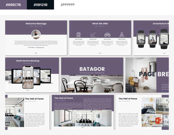 Поскольку более забавные и яркие цвета стали популярными, презентация с фиолетовым фокусом может быть приемлемой для различных целей. Использование цвета в шаблоне Batagor имеет современный стиль с глубоким заголовком выделенного цвета, который лучше всего работает с изображениями.