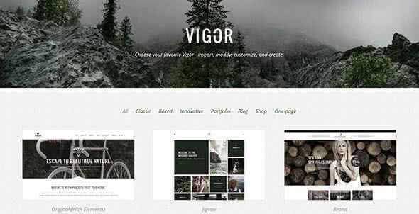 Vigor отличается стильным и минималистичным дизайном, который полностью отвечает соверменным требованиям и лучше всего подходит для блогов или веб-сайтов о путешествиях. Он прост в установке и настройке, имеет множество полезных инструментов и других опций для легкого использования.