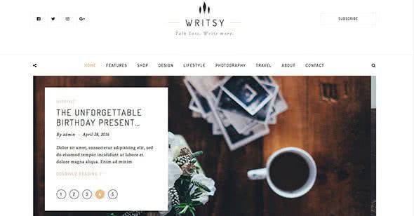 Writsy — еще одна тема WordPress с отличным дизайном. Он лучше всего подходит для блогов, а также для многих других типов веб-сайтов. Дизайн является минималистичным и стильным, отзывчивым, он поставляется со многими галереями изображений, различными стилями домашней страницы, поддержкой детской темы, интеграцией WooCommerce и многими другими замечательными функциями.