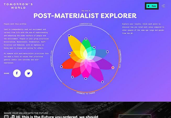 начинает с опроса, который пользователь заполняет, и заканчивает классной визуализацией того, как эти ответы сравниваются с другими. Визуализация данных — это инструмент, помогающий пользователю узнать о себе и окружающем мире.