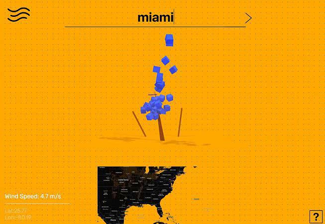 начинает с запроса пользователю ввести место, которым они интересуются для получения дополнительной информации. Результат показывает скорость ветра с помощью дерева с ящиками, которые качаются по мере увеличения скорости. Пользователи также могут использовать карту в нижней части экрана. Это данные, которые требуют взаимодействия.