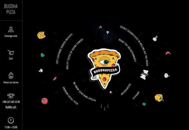 использует круг из текста с ингредиентами, окружающего кусочек пиццы. Часть того, что заставляет круг производить впечатление — это идея, что пицца часто круглая. Даже с треугольным изображением в середине экрана круг очевиден.