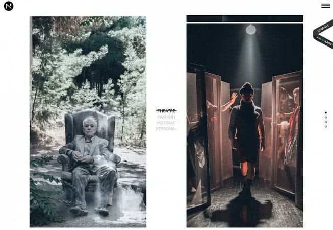 использует другой подход в дизайне веб-сайта, являющимся портфолио. На сайте демонстрируются две вертикальные фотографии бок о бок, с навигацией посередине. Это непривычный подход к дизайну портфолио, но эффективный в том, что пользователи сразу видят больше изображений. Стиль разделенного экрана подразумевает, что оба изображения имеют одинаковое значение, а не одно более важно, чем другое.