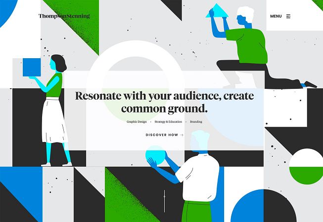 Thompson Stenning использует фигуры в фоновом режиме ив сочетании с иллюстрациями, чтобы создать потрясающий визуальный образ домашней страницы. Возможно, самое интригующее в данной визуальной концепции то, что она использует множество геометрических фигур – прямоугольники, квадраты, треугольники, круги, – в то время как большинство проектов выбирают одну форму, чтобы сосредоточиться на ней.