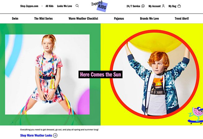 Zappos Kids использует забавную подсветку в красочной схеме, чтобы выделить ключевой текстовый элемент. Это почти похоже на кнопку и помогает посетителям сайта понять, что вся область изображения кликабельна. Подсветка служит для того, чтобы сделать текст более читаемым, а интерактивный элемент — функциональным.