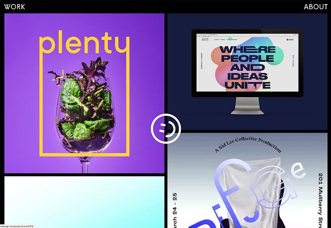 Rui Ma использует квадратные и прямоугольные контейнеры в модульной сетке с портфолио проектов внутри каждого. Это одно из наиболее распространенных и применимых использований геометрии – в качестве элемента контейнера. Что делает тренд выделяющимся, так это круг, смайлик (также геометрическая фигура), который ни на секунду не покидает центр экрана. Черный фон для сетки также является хорошим контрастным элементом для блоков контента.