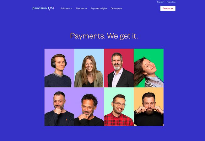 Payvision использует вертикальную сетку фотографий, чтобы выделить членов команды. Сетка не является полноэкранным вариантом, как в других примерах, она находится в центре для привлечения внимания.