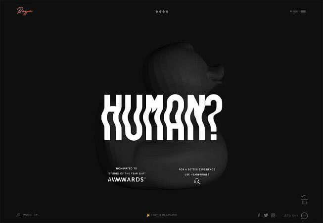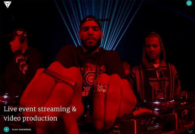использует видео-подход с более кинематографическим опытом. На главной странице представлены полноэкранные видеоклипы с коротким текстом и только несколько небольших элементов на экране. Пользователь чувствует, что он будто смотрит видео, благодаря этому дизайну, не прыгая вокруг домашней страницы веб-сайта. Опять же, навигация спрятана в иконку гамбургера — цветной круг помогает ему выделяться немного больше — а маленькая анимированная стрелка внизу справа побуждает пользователей прокручивать страницу, когда они закончат просмотр видео.