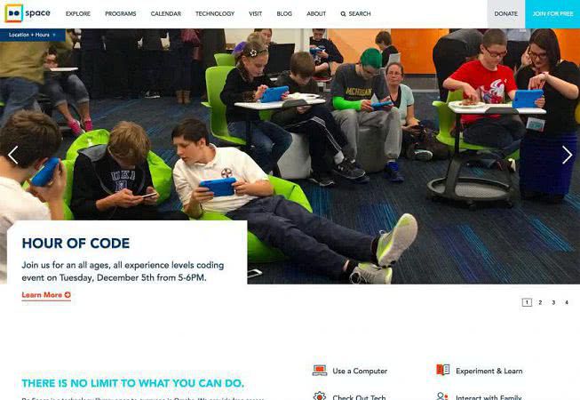 Do Space вставил белую коробку в нижний угол изображения, чтобы большая часть изображения была видна. Белый бокс стекает в белое пространство внизу, так что он почти выглядит так, как будто он выходит из панели ниже. Этот метод помогает соединить основной слайдер с контентом ниже (и может даже способствовать прокрутке).