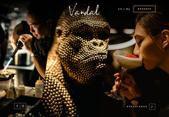 использует тонкие вертикальные элементы навигации по обеим сторонам экрана, которые изменяют hero-изображение при наведении на них курсора. Каждое слово также можно кликнуть, чтобы перейти на другую страницу. На мобильном UX остается таким же, хотя и с другим соотношением сторон.