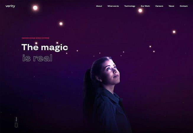 имеет глубокий фиолетовый фон с анимированными огоньками. Изображение выглядит как ночное небо (обычно используется для фиолетовых изображений и фонов). Что отлично работает в этом фиолетовом цвете и дизайне, так это связь между изображением, цветом и текстом. Заголовок «Магия реальна» отражает эмоциональную связь, которую вы ожидаете получить от фиолетового. Цвет идеально подходит для такого дизайна.