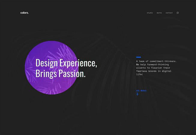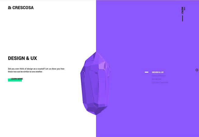 имеет разделенный экран с фиолетовой стороной, которая содержит негабаритный навигационный элемент. В центре экрана также есть крутая плавающая пурпурная скала или драгоценный камень, чтобы привлечь внимание к дизайну. Опять же, цвет используется для создания центральной точки и помогает пользователям понять, как взаимодействовать с дизайном.