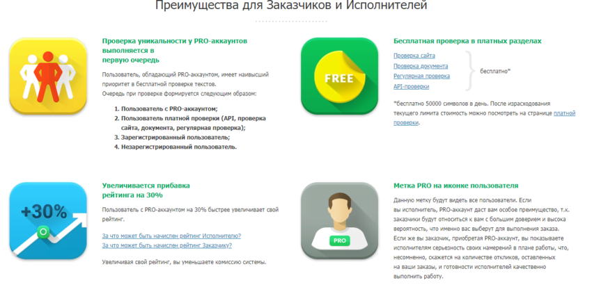 Рассмотрим на примере Text.ru — это один из самых крупных и известных проектов для проверки уникальности текста. Наличие платных тарифов не делает сервис платным, так как на данный момент у любого пользователя есть возможность проверить свои тексты не заплатив ни копейки, достаточно подождать в очереди 10-20 текстов. На Text.ru помимо инструмента для проверки текста есть еще и биржа копирайтеров — создатели зарабатывают на заказчиках и исполнителях, предоставляя удобную возможность взаимодействовать между собой.