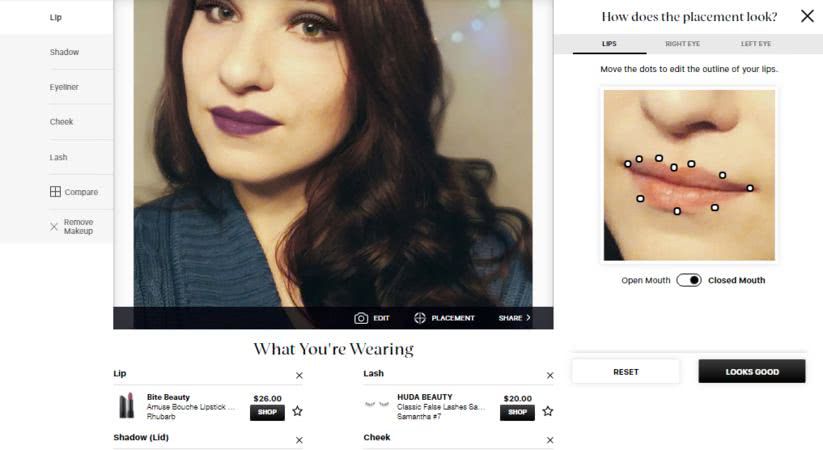 Инструмент определяет на фото овал лица, брови, глаза, губы и скулы, с помощью точек его можно поправить. И применяет соответствующий продукт на лице — закрашивает губы помадой выбранного цвета, приклеивает накладные ресницы.