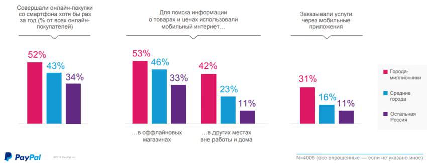В 2019 году продолжится рост числа покупок с мобильных устройств. Исследование 2018 года PayPal и Data Insight показало, что среди жителей городов-миллионников и средних городов около 50% покупают со смартфона.