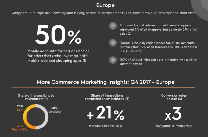Покупатели стали чаще пользоваться мобильным телефоном для просмотра товаров и покупок, в том числе в приложениях: по данным исследования Criteo Global Commerce за 2017 год ритейлеры с приложением для покупок в Европе сгенерировали 44% своих продаж на мобильных устройствах. Транзакции с десктопов и мобильных устройств делятся пополам, доля покупок со смартфона увеличилась на 21% по сравнению с 2016 годом.