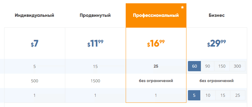 На многих сайтах с сервисами, программами или услугами можно выбрать один из нескольких тарифов. Обычно их три-пять от самого дешевого до профессионального с большим пакетом опций. Есть способ привлечь внимание к определенному тарифу, который выгоднее всего продавать: отметить его какой-нибудь плашкой, окружить другими тарифами и поместить в центр.