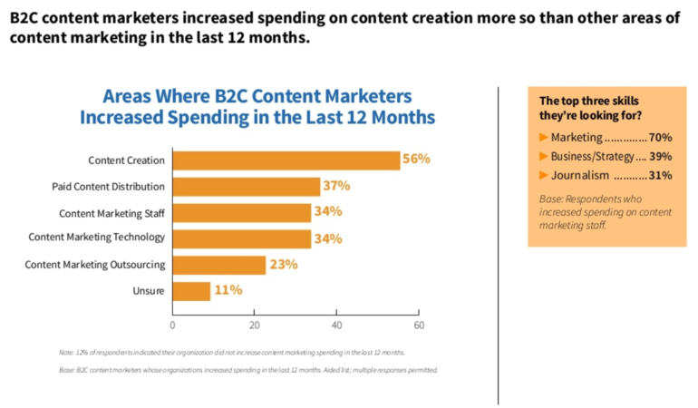 Согласно исследованию, проведенному Институтом контент-маркетинга в 2019 году, 56% контент-маркетологов в последние 12 месяцев увеличили расходы на создание контента.