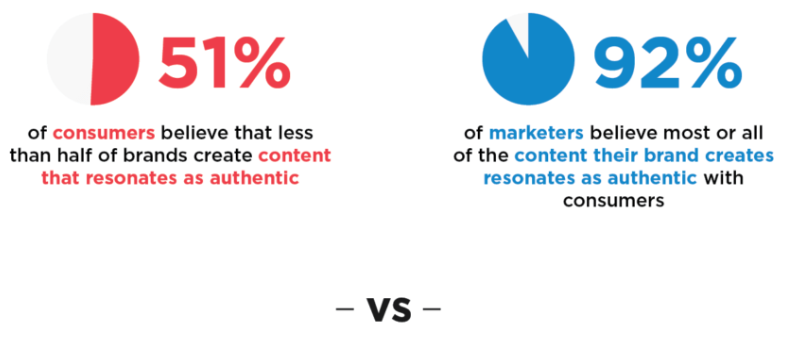 В чем же проблема? 92% маркетологов считают, что контент, который они создают, транслирует подлинность, но 51% потребителей считают, что менее половины всех брендов достигают этого.