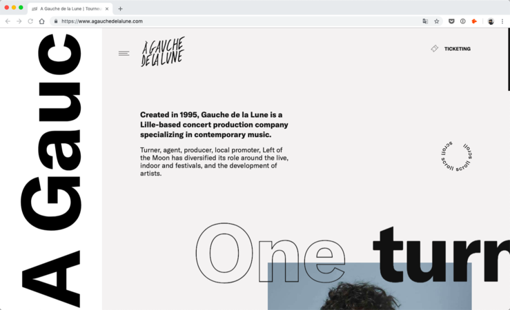 Главный раздел Gauche de la Lune имеет замечательный макет сам по себе! Все различные элементы дизайна, от логотипа и изображений до текста и индикатора прокрутки, кажутся повсеместными. Но на самом деле это не так, иначе бы это не выглядело так хорошо!