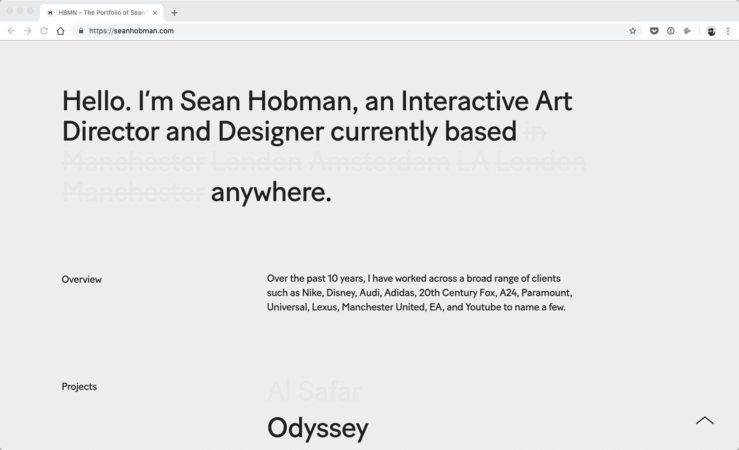 Еще один портфолио, которое любезно предоставлено Шоном Хобманом. Оно не только простое, но и ключевой особенностью является типографика, которая включает в себя анимацию, оттенки серого и довольно безупречный макет дизайна.