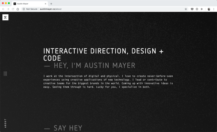 Портфолио Austin Mayer имеет классный, анимированный экран загрузки, а также интерактивную анимацию на своей домашней странице. Меню анимированы, как и переходы страниц, ссылки и фон. В конце концов, он интерактивный дизайнер!
