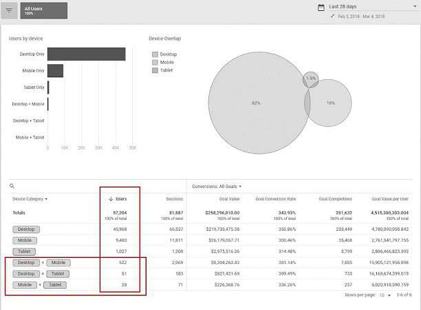 Аналитика в Google Signals (beta) покажет, сколько человек смотрели сайт с разных типов устройств, а сколько пользовались несколькими гаджетами для посещения сайта. К примеру, если пользователи смотрели сайт с мобильного устройства и с десктопа, это будет отражено в таблице в графе Десктоп + Мобильные.