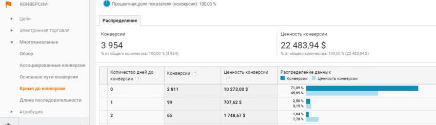 Отчет «Время до конверсии» покажет, как долго пользователи тратят время на сайте перед тем, как что-то купить или заказать. Он находится в разделе «Многоканальные».