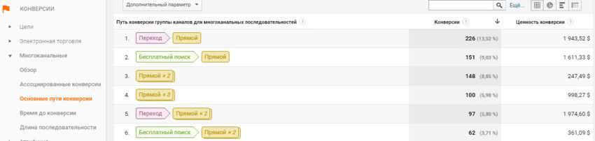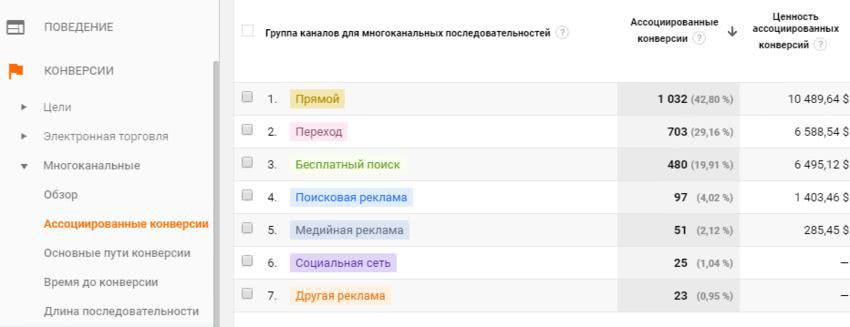 Также будет полезен отчет «Ассоциативные конверсии», который выведет данные о том, какие каналы были ассоциативными для конверсии, какие переходы были значимыми.