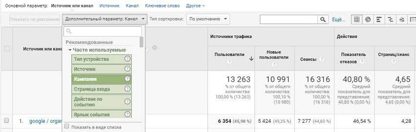 Чтобы оценить конкретный канал по рекламным кампаниям в разделе «Источник\канал», нужно кликнуть по нему и включить в Дополнительных параметрах пункт «Кампания». В таблице вы увидите трафик с показателями его качества, глубину просмотра, длительность сеанса пользователя и прочее.