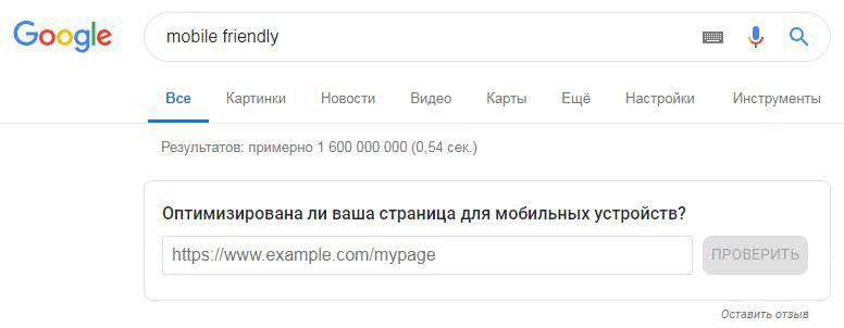 Проверить сайт можно прямо в SERP: если ввести в поисковик «mobile friendly», появится поле для ввода адреса сайта.