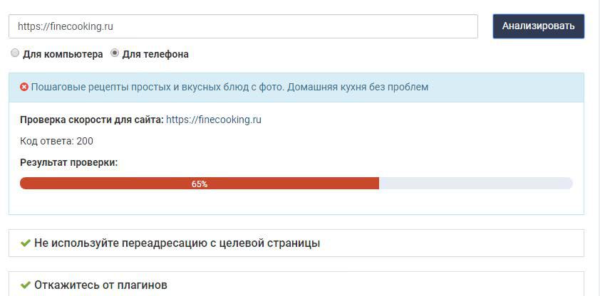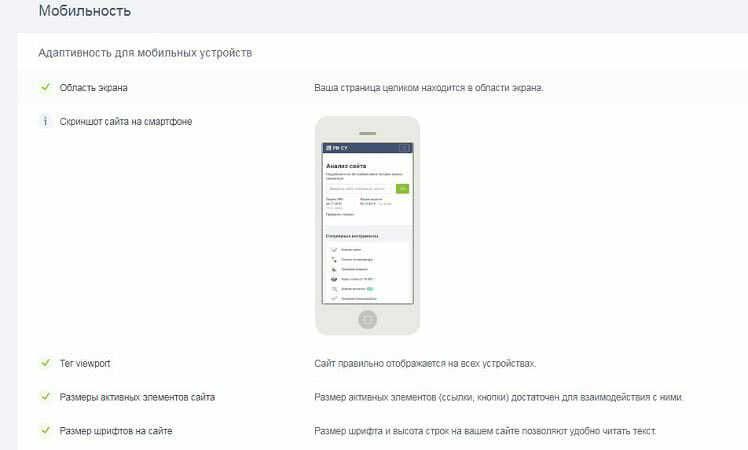 Анализ сайта от PR-CY проверяет ресурс по более 70 параметрам, включая и мобилопригодность. К каждому пункту проверки дает пояснение и совет. Для проверки оптимизации хватит функциональности бесплатной версии.