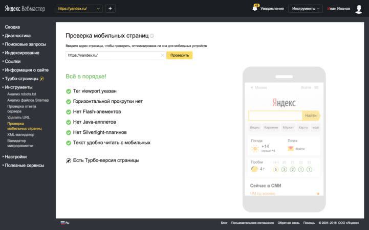 Вебмастер Яндекса тоже предлагает проверку на мобилопригодность и выводит краткий список необходимых параметров.